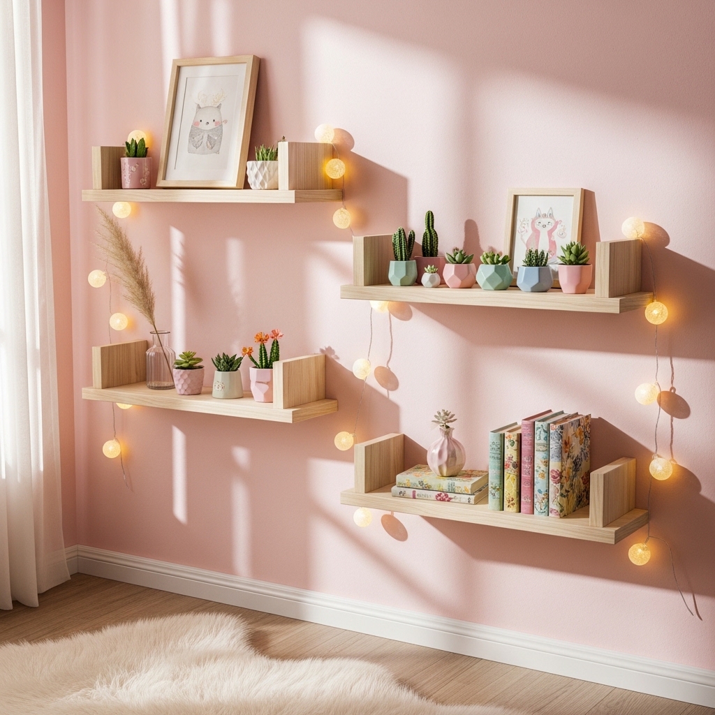 Floating shelves decorated with small plants, figurines, candles, or books add personality and function.