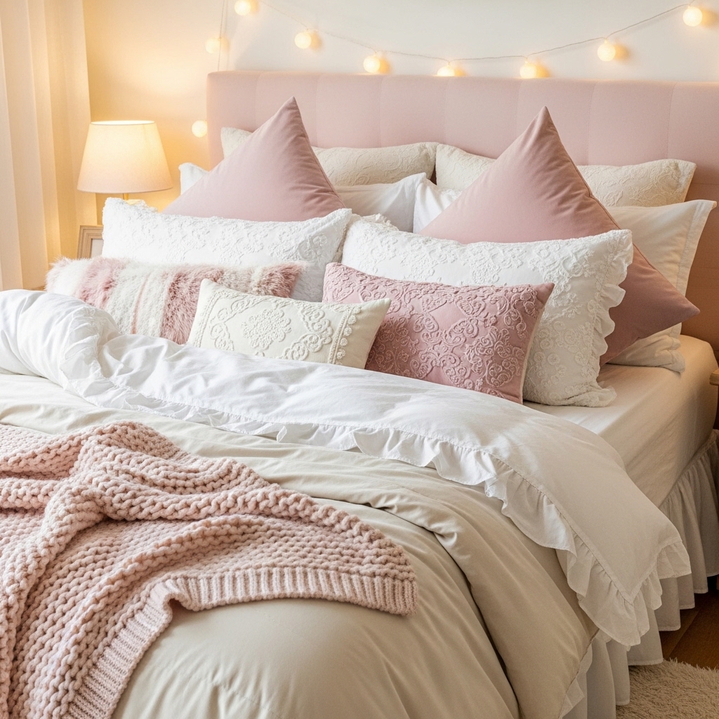 This is essential in soft aesthetic bedroom ideas, creating a warm and tactile focal point.