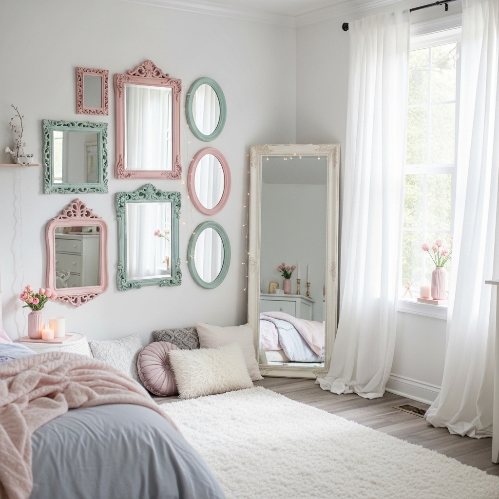 Mirrors also add a decorative touch that complements the pastel theme.