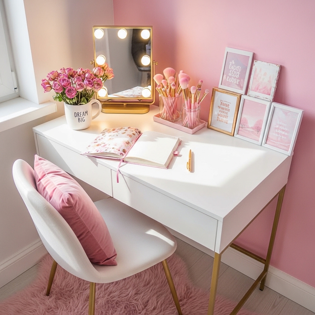 A pastel-colored desk or vanity adds functionality and charm. Decorate with cute organizers, mirrors, and fairy lights to enhance the soft girl vibe.