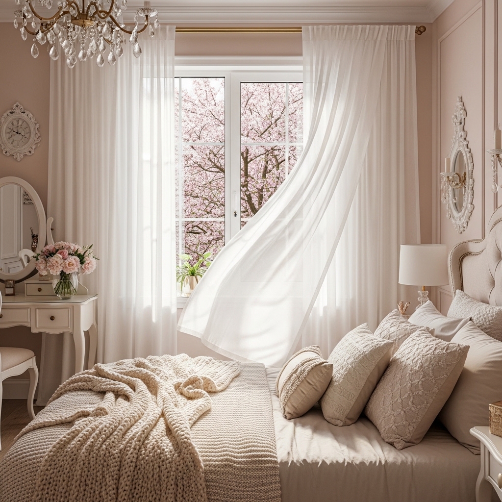 Sheer or lightweight curtains in pastel shades let natural light filter softly into the room.