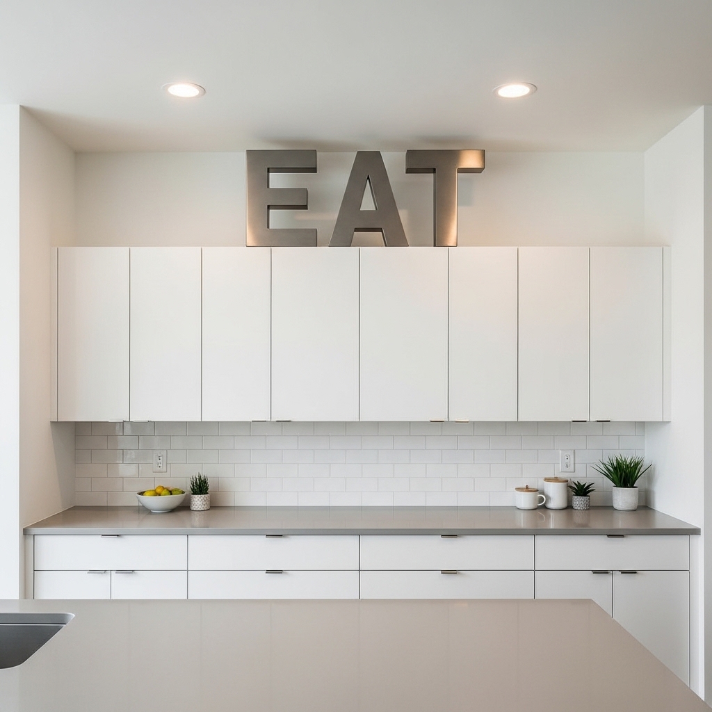 Oversized letters or subtle signage can fill empty vertical space beautifully. This works well in farmhouse or modern rustic kitchens.