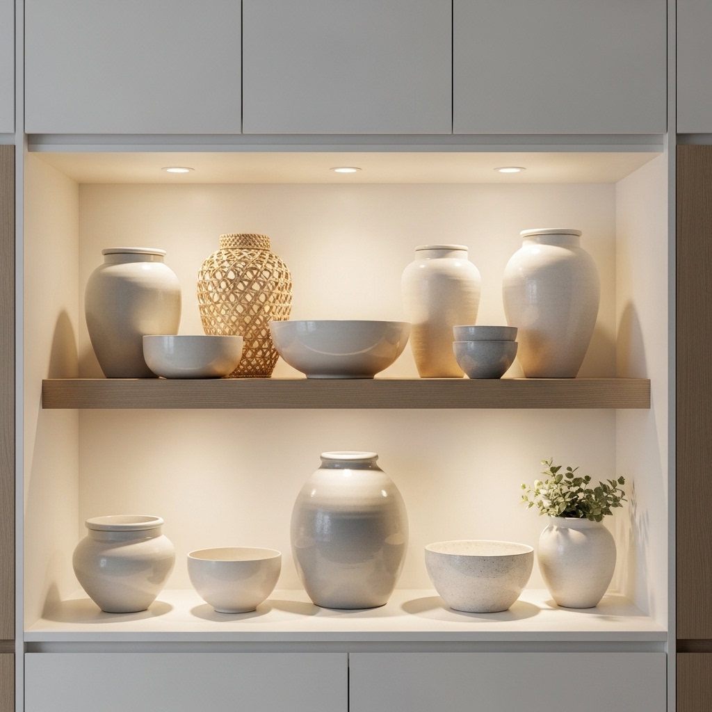 Displaying ceramic vases, pitchers, or pottery creates a curated gallery-style effect. Neutral or earthy tones work beautifully in modern kitchen decor.
