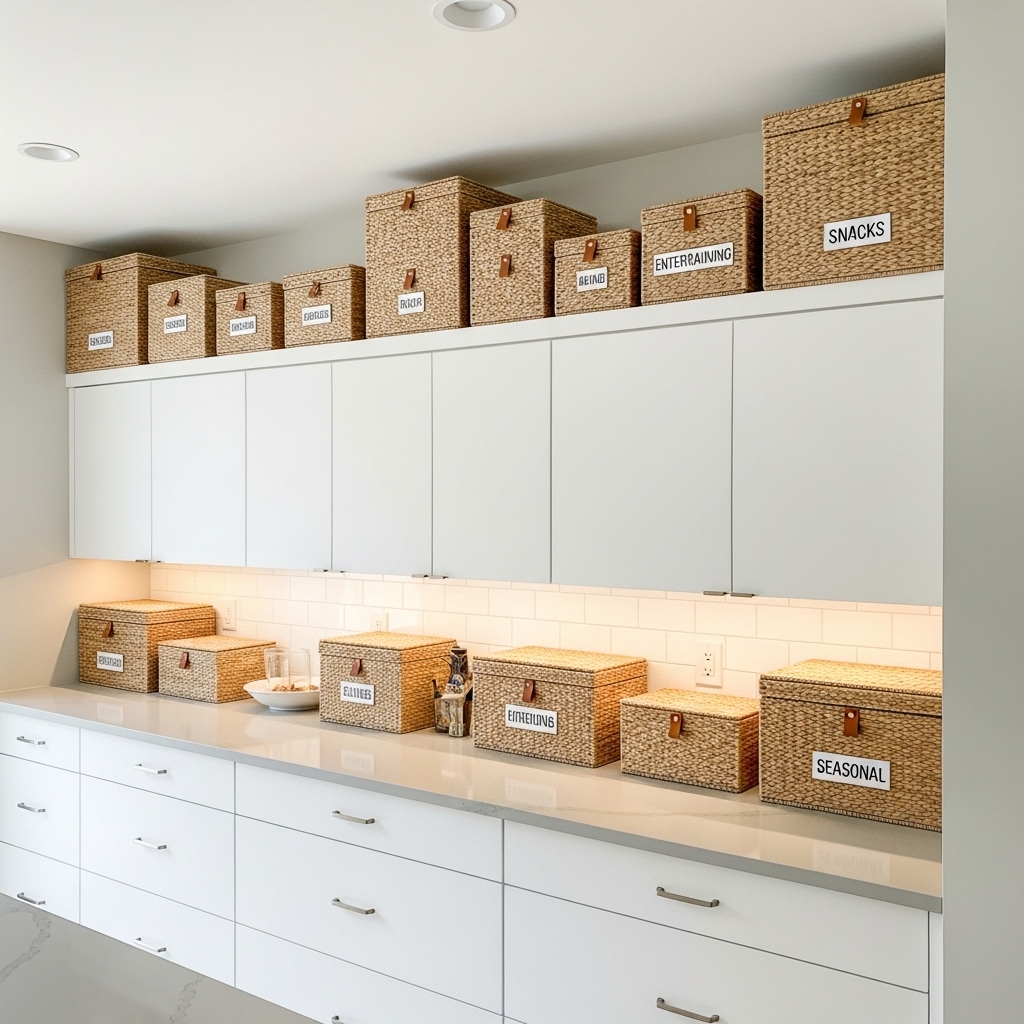 Woven baskets instantly add warmth and texture above kitchen cabinets. They provide hidden storage for seasonal items while keeping the space visually organized.