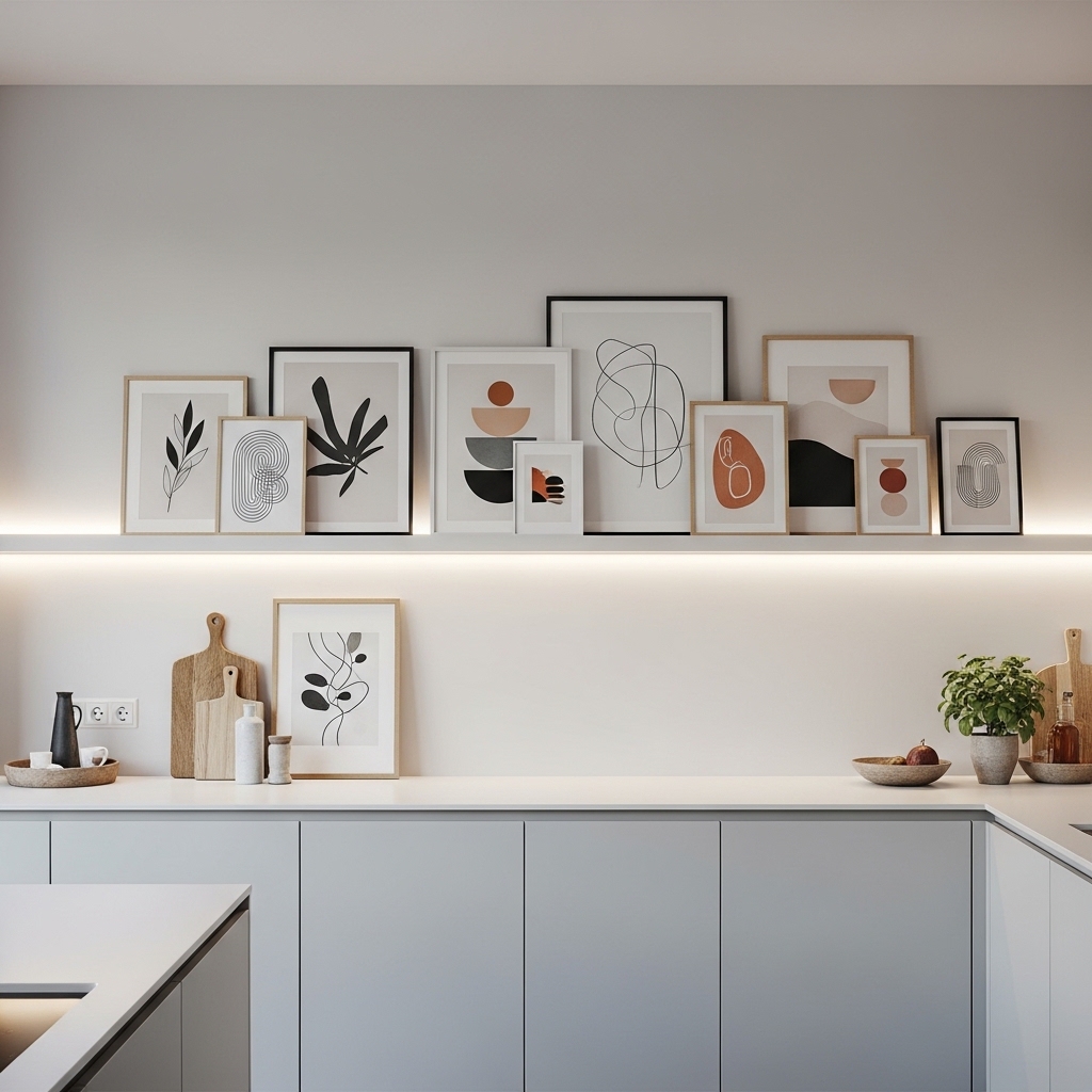 Leaning framed prints or artwork above cabinets introduces a subtle decorative layer. Black-and-white prints work well in modern kitchens.