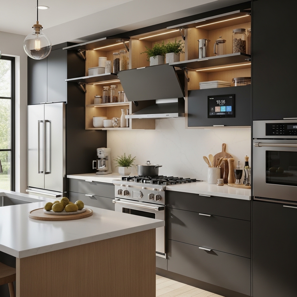 Decorative storage boxes keep rarely used kitchen items out of sight while enhancing visual appeal. Fabric or wooden boxes maintain a clean look.