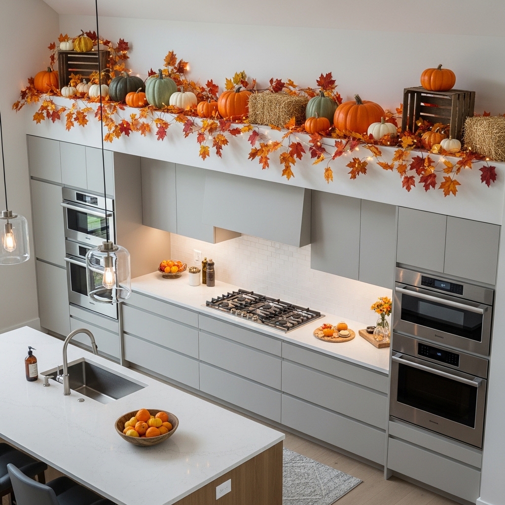 The space above cabinets is perfect for seasonal kitchen decor. Think pumpkins in fall, garlands in winter, or florals in spring.