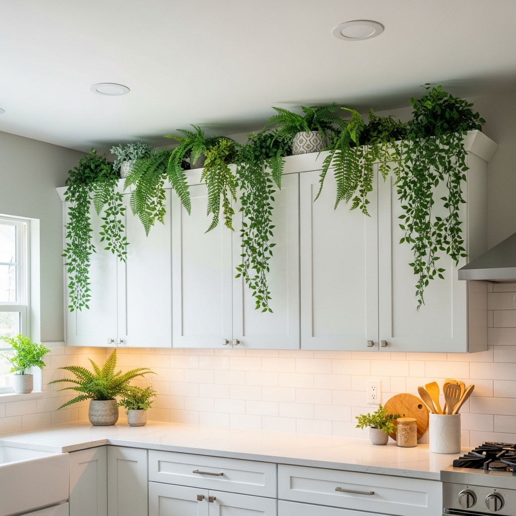 Faux greenery softens the hard cabinet lines and brings life to upper spaces. Trailing vines or potted plants add movement and visual interest.
