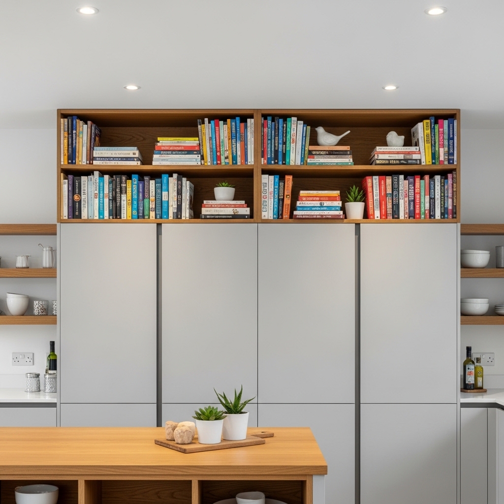 Stacking decorative cookbooks above cabinets adds personality and color. Choose books with attractive spines that match your kitchen palette.