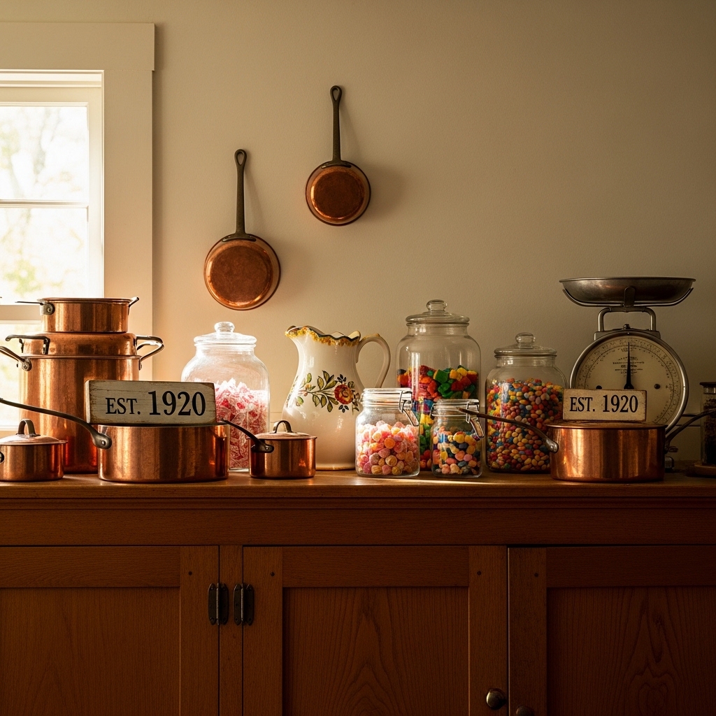Showcasing vintage cookware, enamel pitchers, or antique pieces adds personality. It creates a warm, collected-over-time feel.
