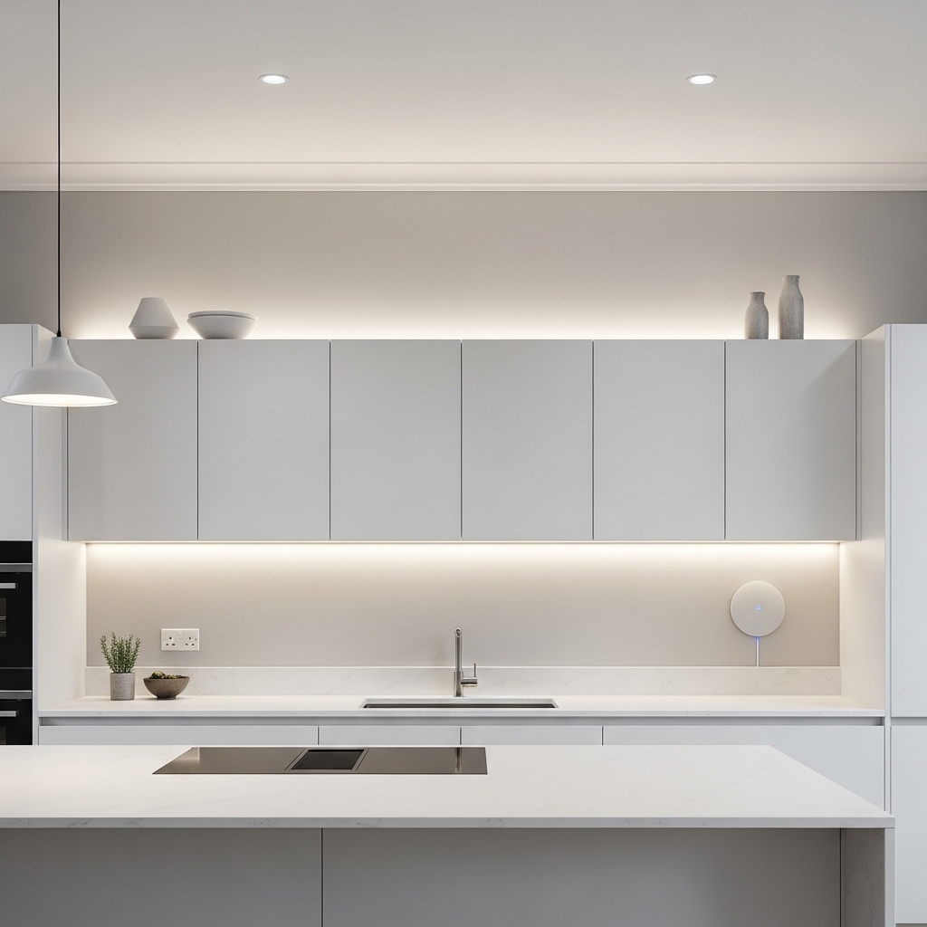 Installing LED strip lighting above kitchen cabinets creates a soft ambient glow. It highlights decorative elements and adds depth.