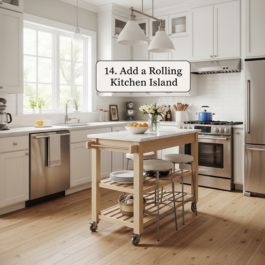 Choose a kitchen island on casters. Use it for prep space. Use it for dining. Roll it against the wall when not needed.