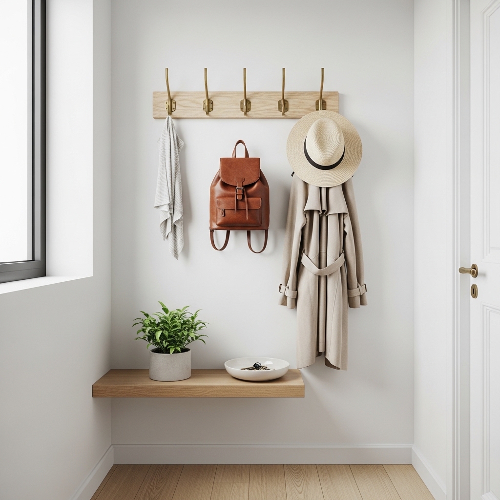 Install a wall-mounted coat rack near the door. Hang coats and bags on the hooks. The floor stays clear.