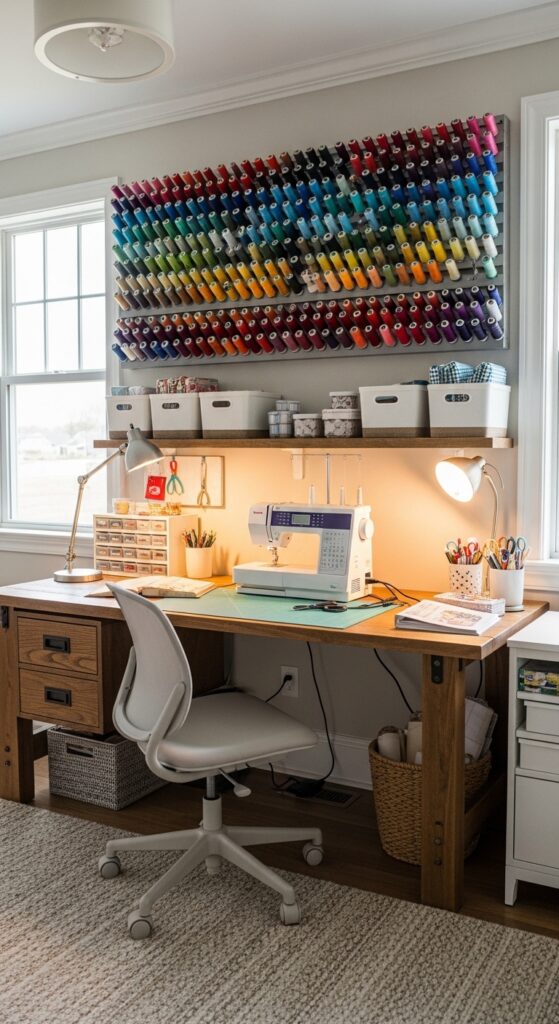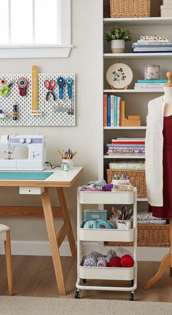 A pegboard wall is a practical and stylish way to organize sewing tools. Items like scissors, rulers, measuring tapes, and rotary cutters can be hung neatly on hooks.