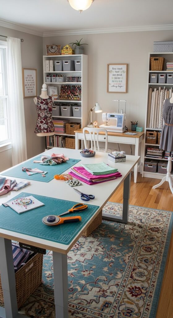 Your sewing room can double as a creative studio by displaying beautiful fabrics as decor. Open shelves, racks, or baskets can showcase your favorite prints and textures.