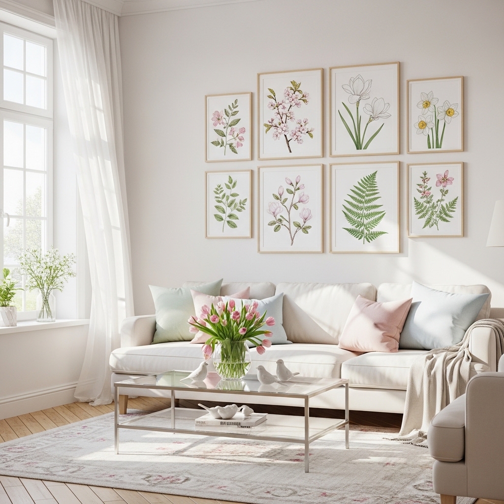 Swap dark paintings for prints of leaves, ferns, or flowers. Frame them in simple white frames.