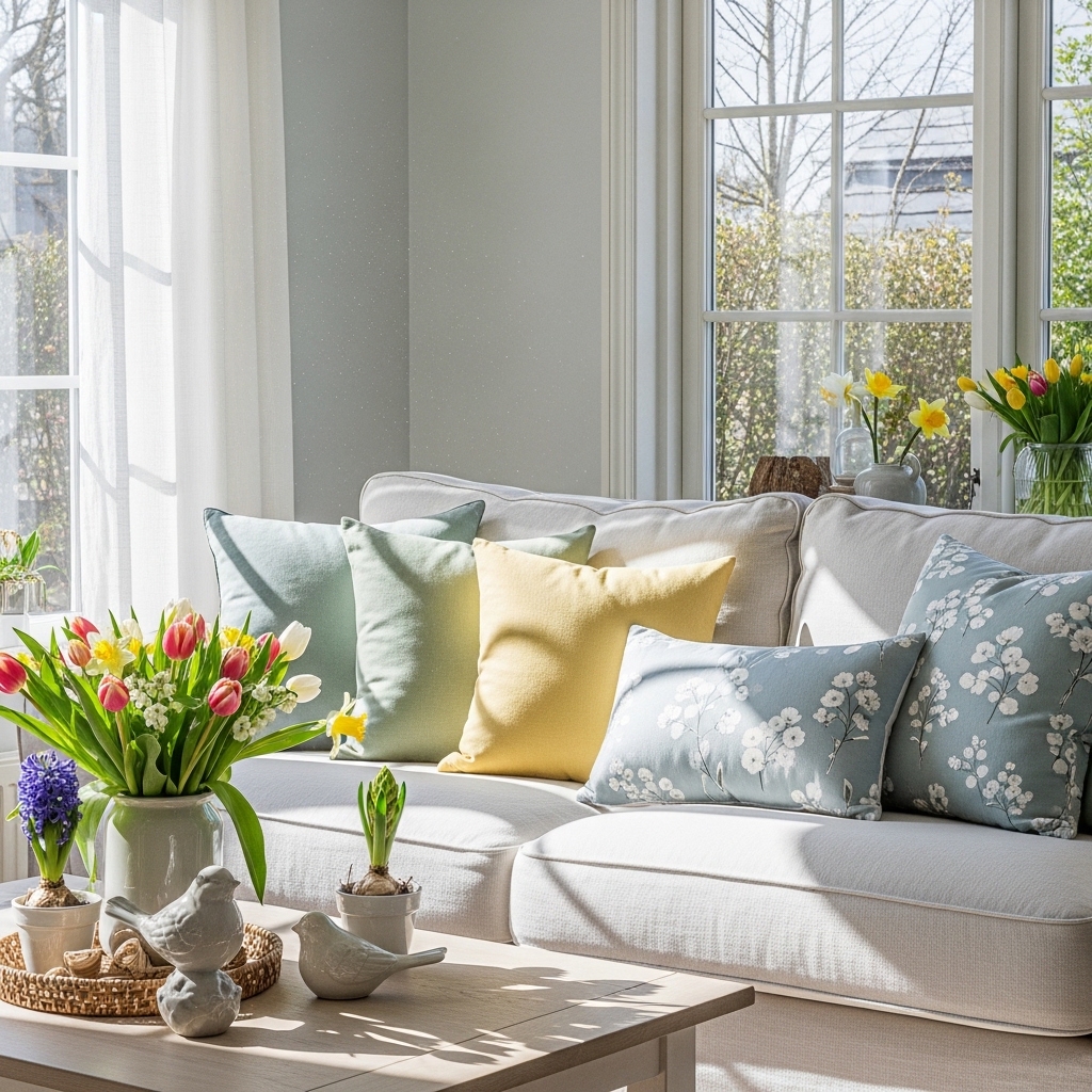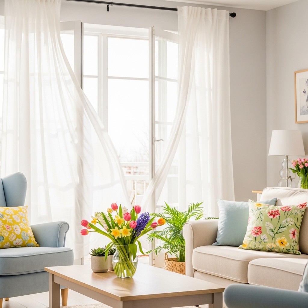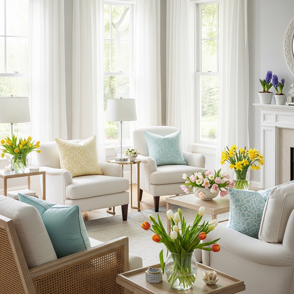 Spring demands change. Lighter fabrics. Brighter colors. Open windows. The living room should feel awake again.