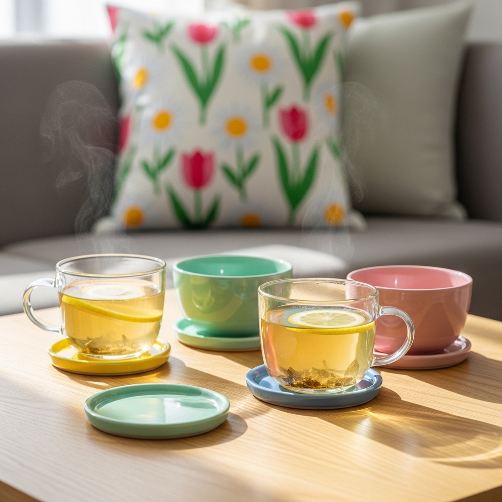 Replace dark coasters with bright ones. Yellow. Coral. Mint. The change is subtle but effective.