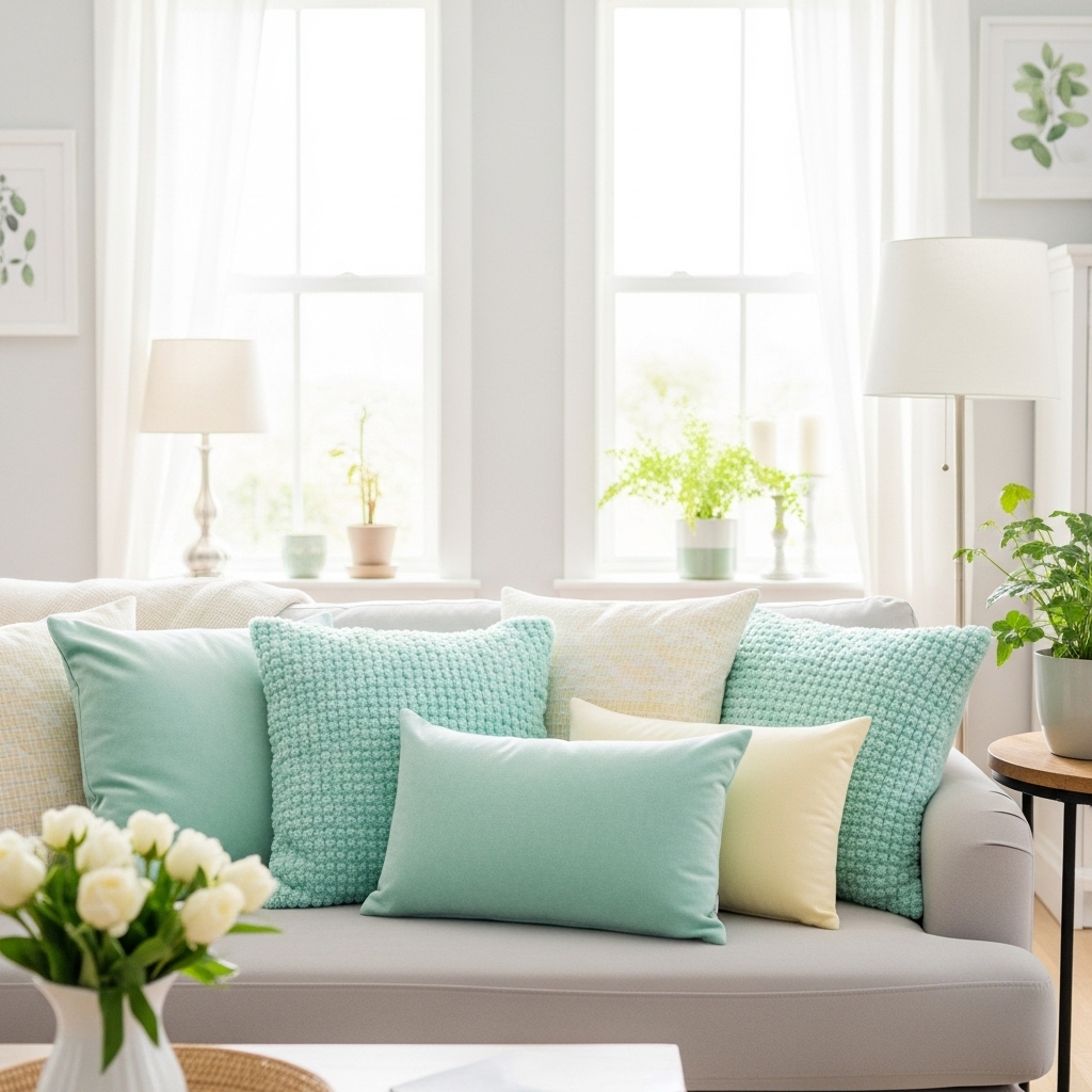 Replace dark winter pillows with mint green ones. Use two or three on the sofa.