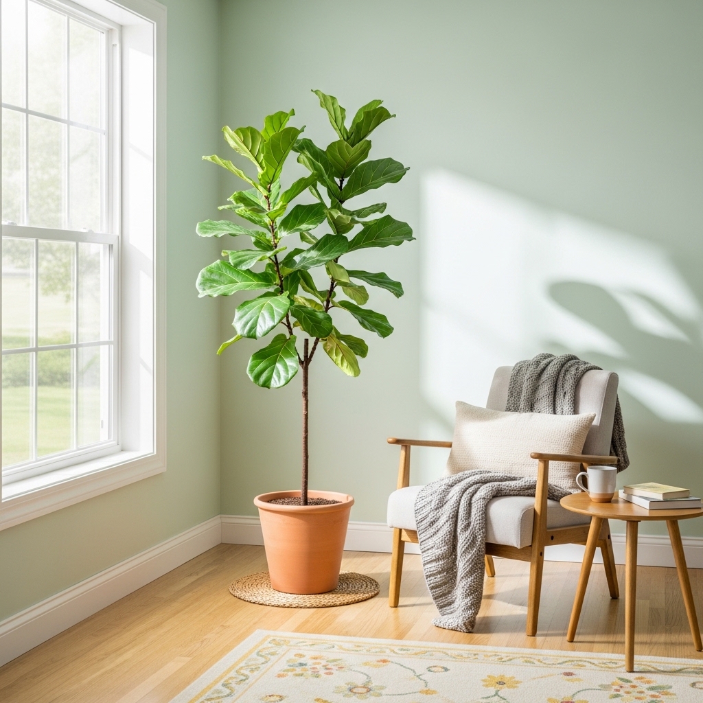 A large plant fills an empty corner. A fiddle leaf fig has large leaves. The leaves are glossy. The shape is sculptural.