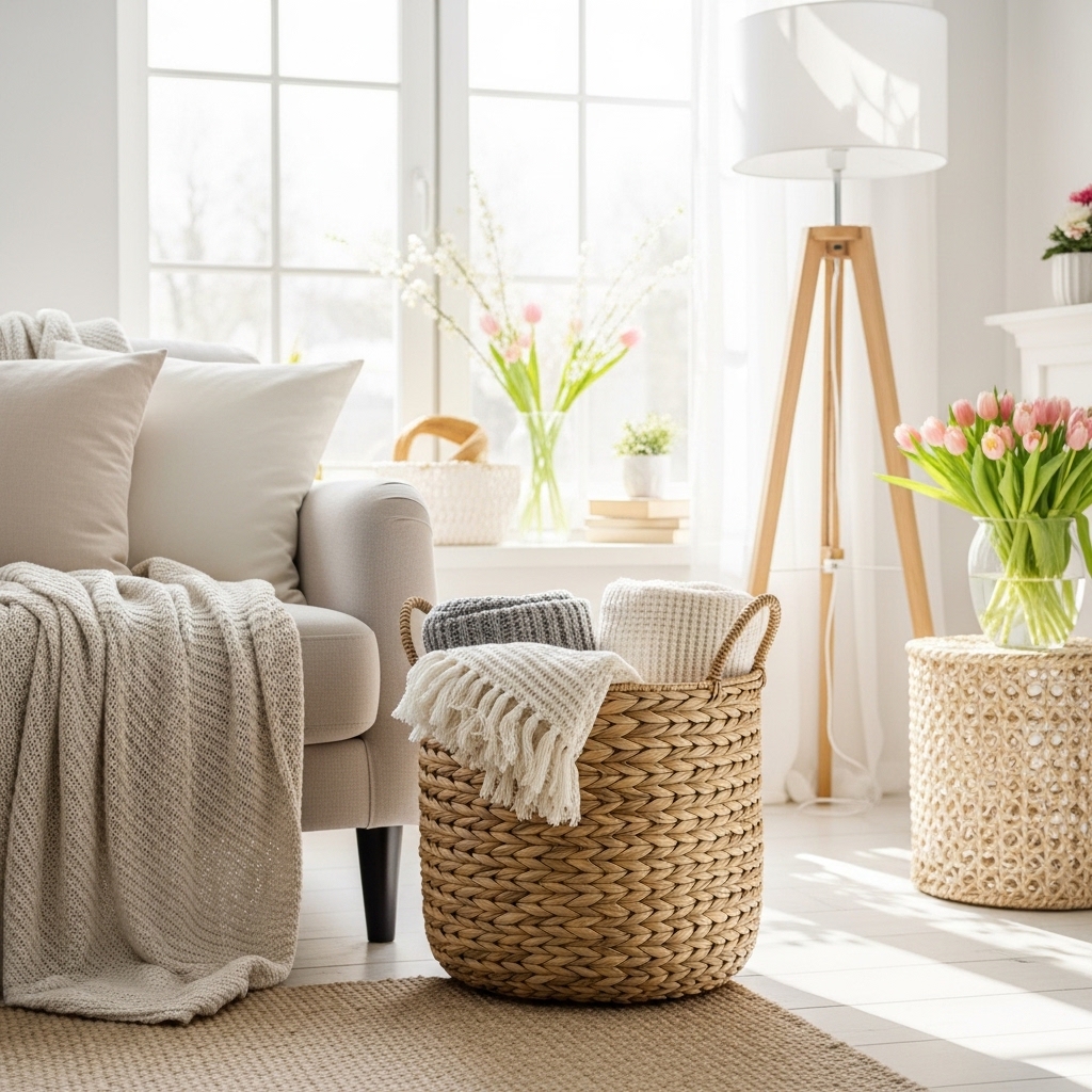 Place a large basket next to the sofa. Store extra blankets inside. The basket adds texture.