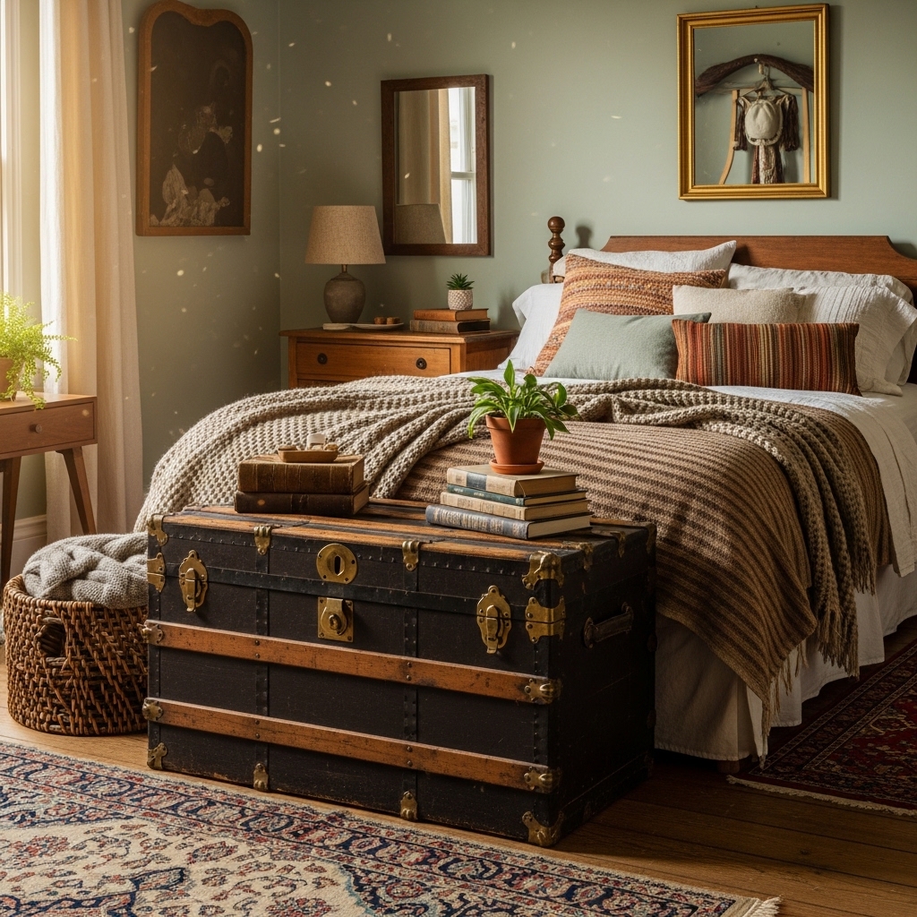 Vintage trunks are common thrift store finds that can serve as both storage and decor. Placing a trunk at the foot of the bed creates a stylish focal point while providing extra space for blankets, pillows, or seasonal clothing.