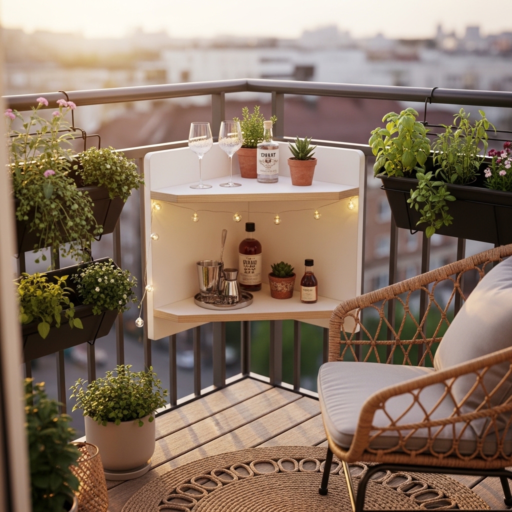 Mount a floating corner shelf in the corner of your balcony at 26 inches high (bar height).