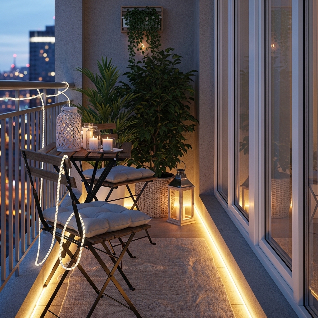 For evening users wanting ambiance without taking space, do this when your balcony has no overhead lighting.