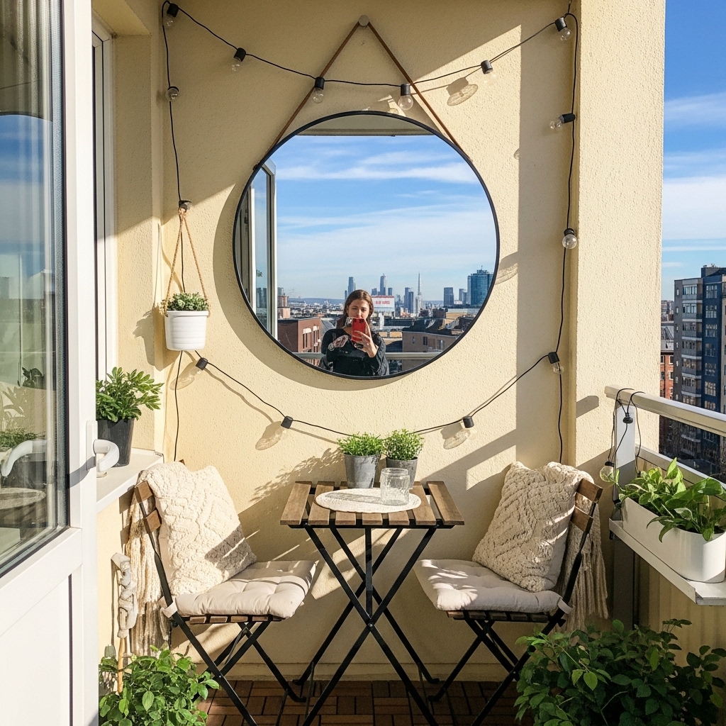 This works because mirrors trick the eye into seeing twice the depth, instantly making the balcony feel larger.
