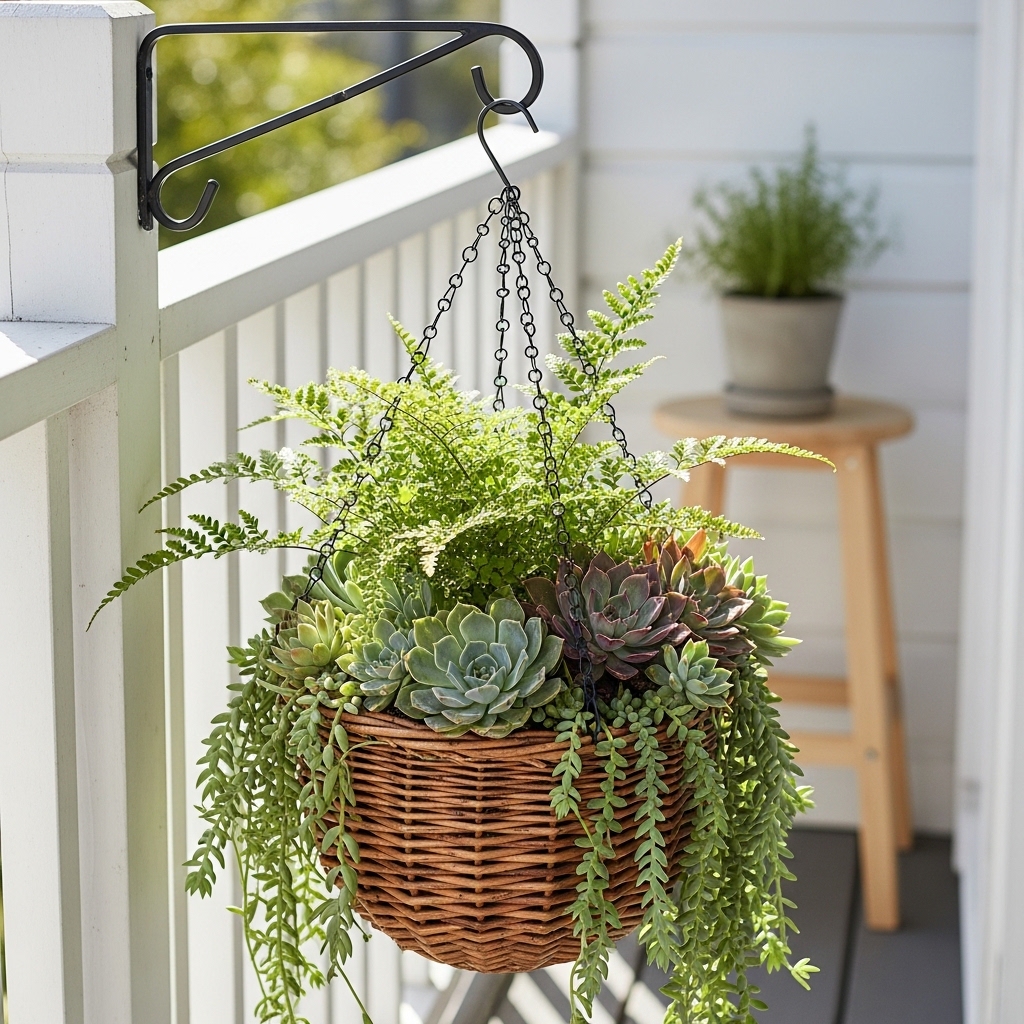 This works because hanging planters use overhead space that nothing else can occupy in tiny balconies.
