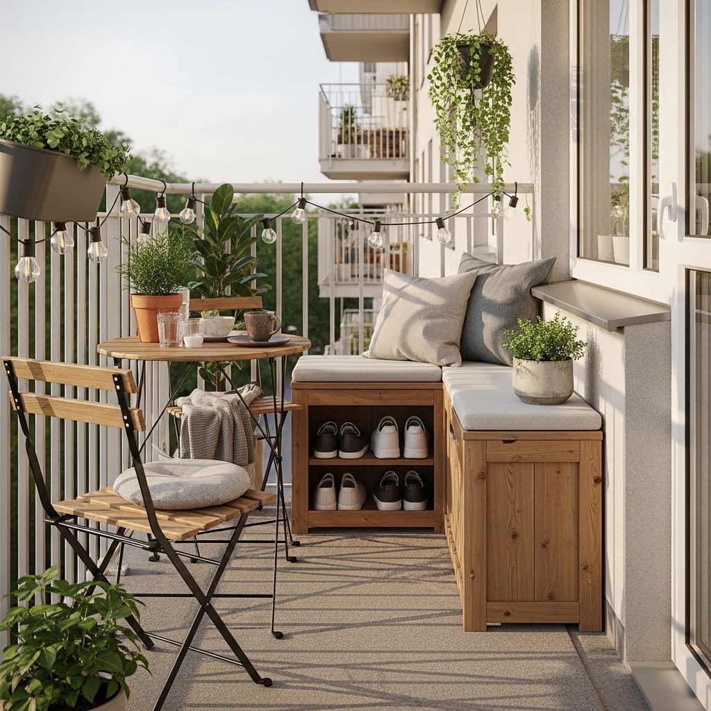 For entryway-style balconies, use this when you need seating that hides your outdoor shoes and slippers.