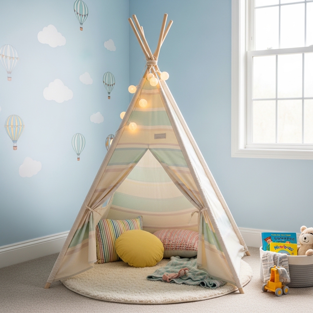 Pro Tip: Fill the teepee with soft floor cushions and a small basket of board books. The cushions invite sitting. The books invite reading.