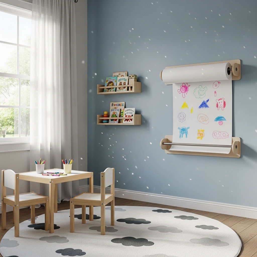 Pro Tip: Install a small shelf below the paper holder. The shelf holds washable crayons and markers within your toddler’s reach.