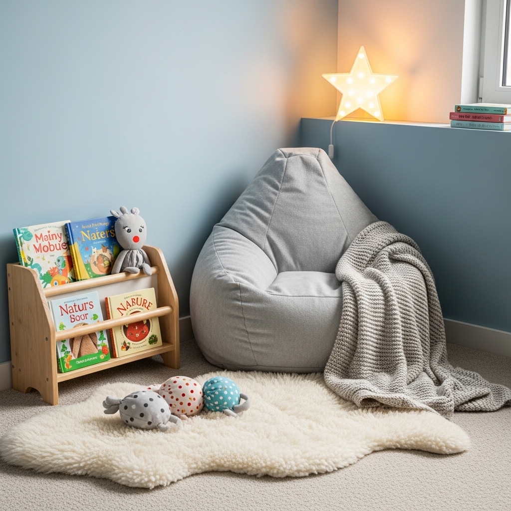 Designate a corner of the room with a soft rug, a small tent or canopy, stuffed animals, and a few calm books.