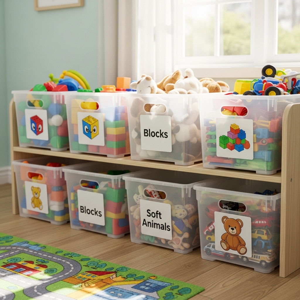 9. Use Clear Bins with Picture Labels for Toy Storage
