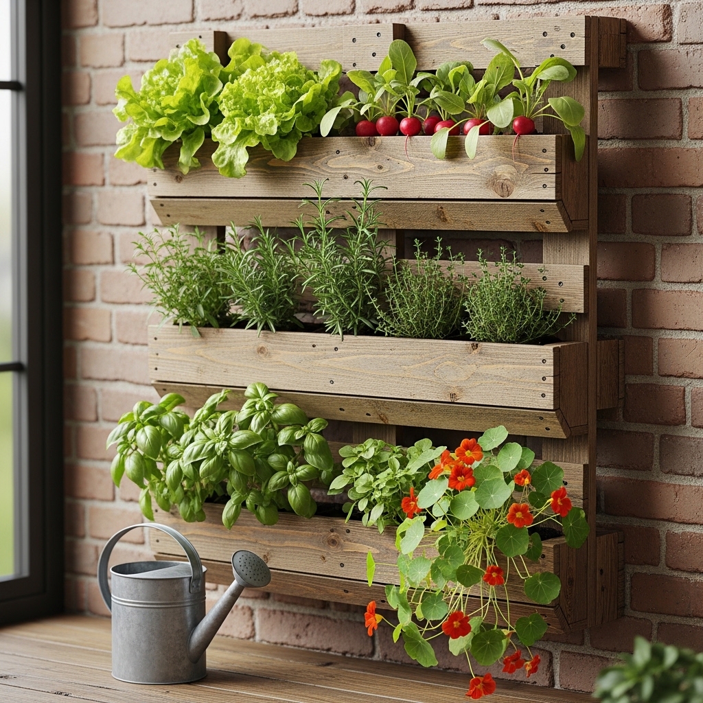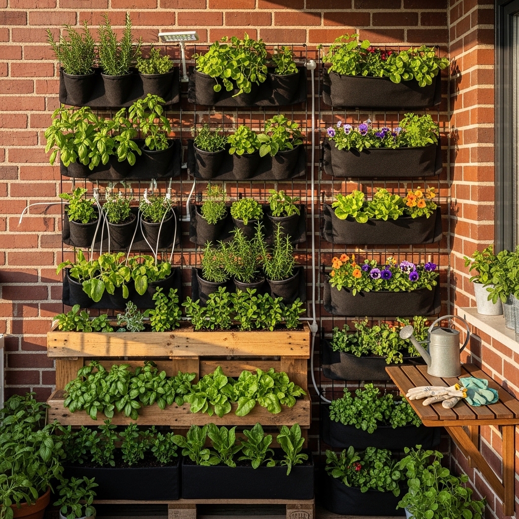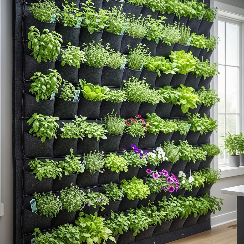 Install fabric or modular pocket planters on a wall to grow herbs, flowers, or small greens.
