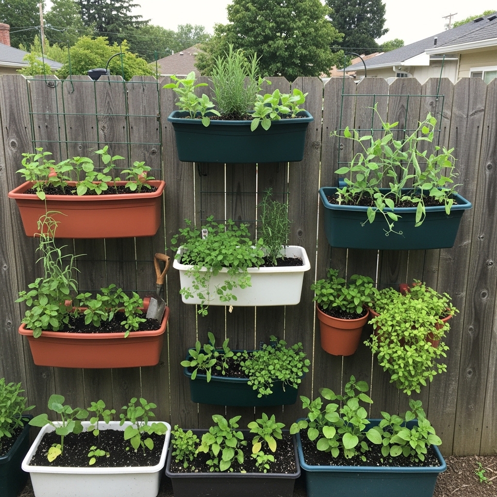 Attach planters directly to fences to grow herbs, flowers, or small vegetables.