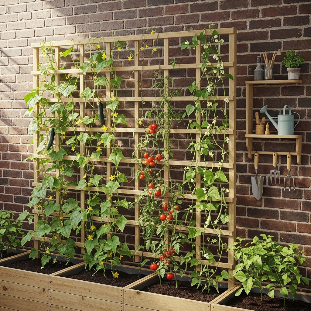 Set up a sturdy trellis against a wall or fence to grow climbing vegetables like cucumbers, beans, or tomatoes. Train plants to grow upward using ties or supports as they develop.