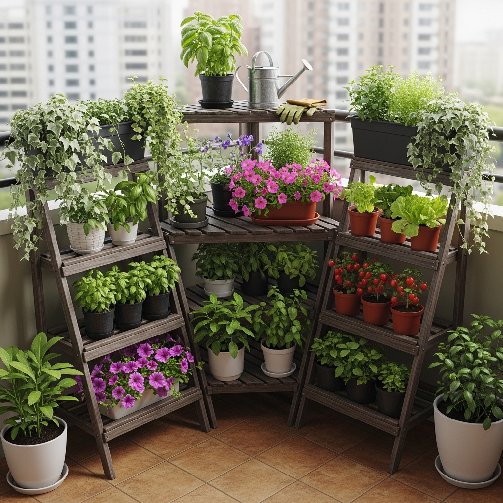 2. Use Tiered Plant Stands to Maximize Balcony Corners