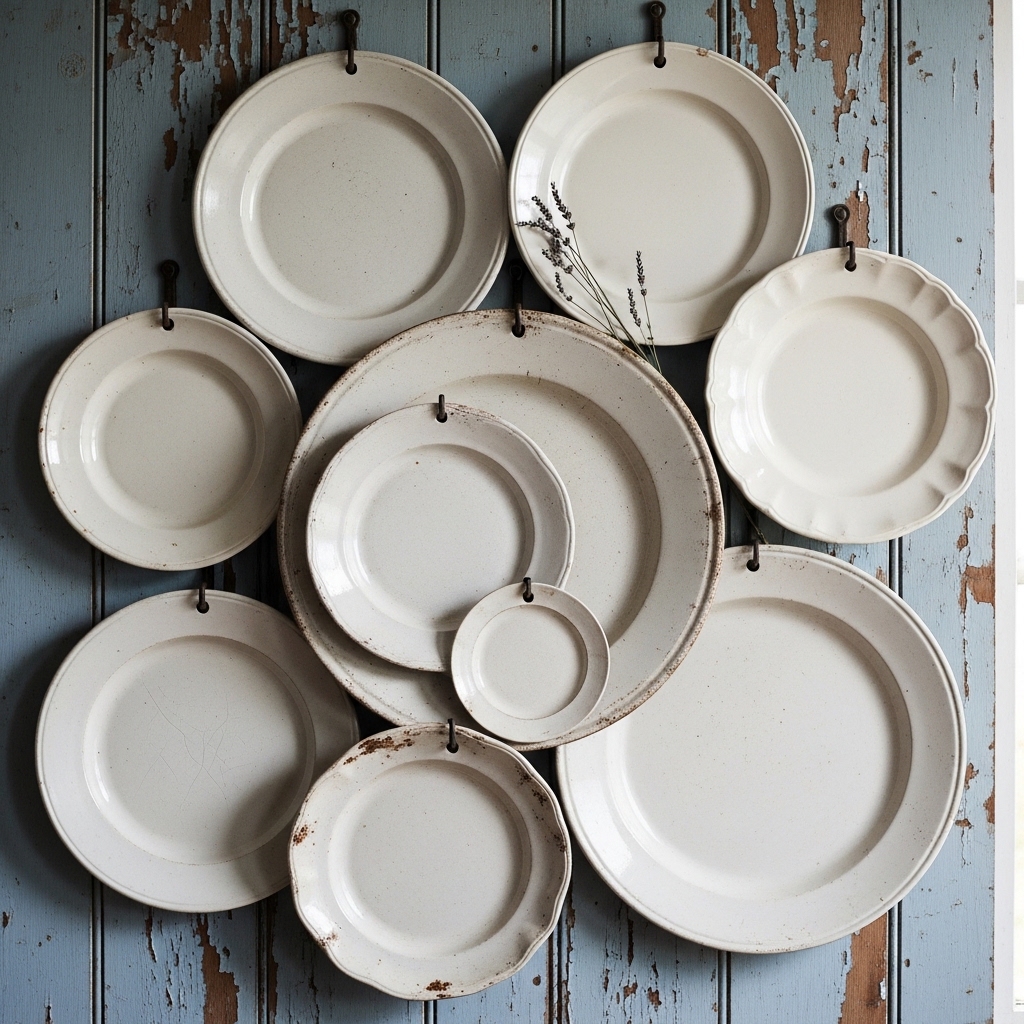 Collect ironstone platters in different sizes. Hang them on a wall in a cluster. The white will contrast with the wall color.