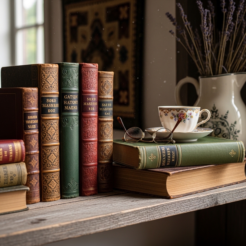 Arrange vintage books on a shelf by color. Cream, sage, rose, and blue. The spines should be worn. The pages should be yellowed.