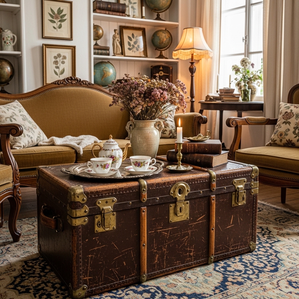 Use a vintage steamer trunk as a coffee table. The leather should be worn. The latches should be brass.