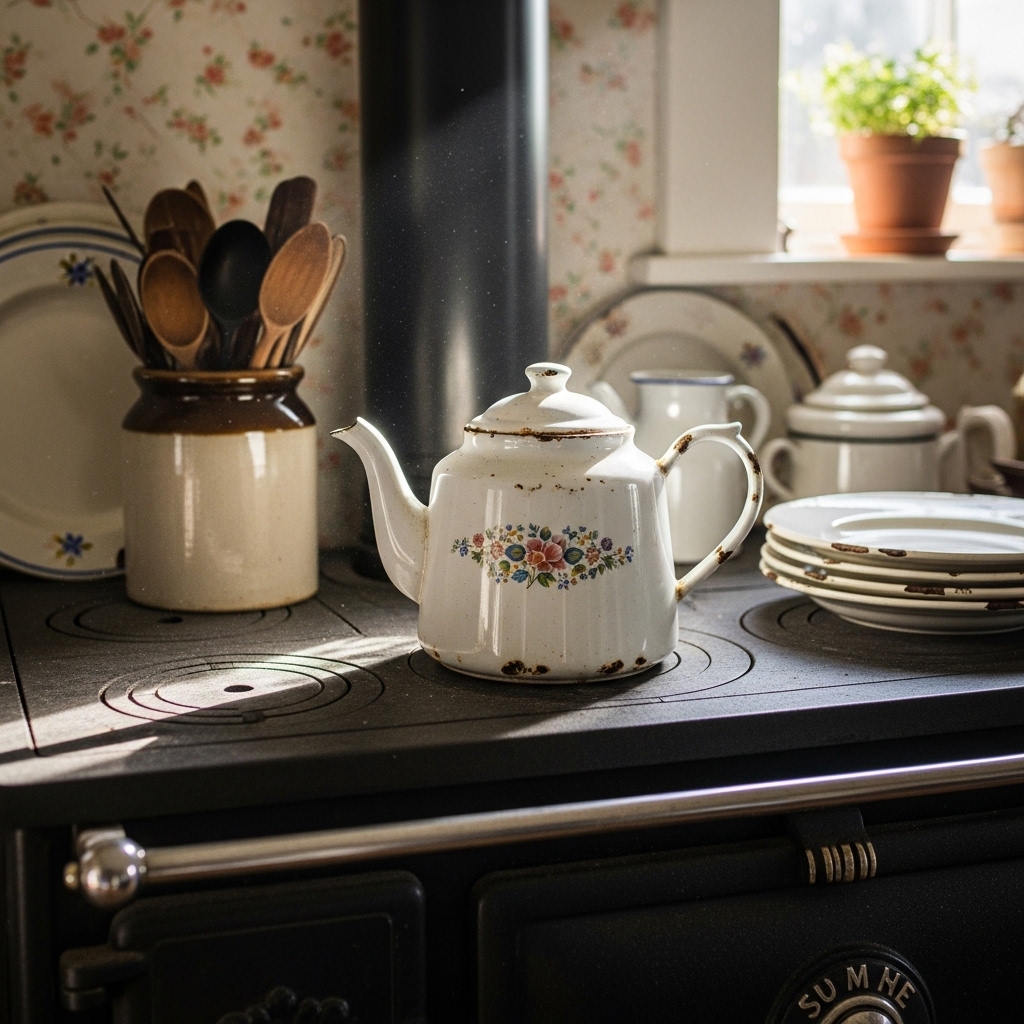 Keep a ceramic teapot on the back of the stove. The glaze should be crackled. The lid should be chipped.