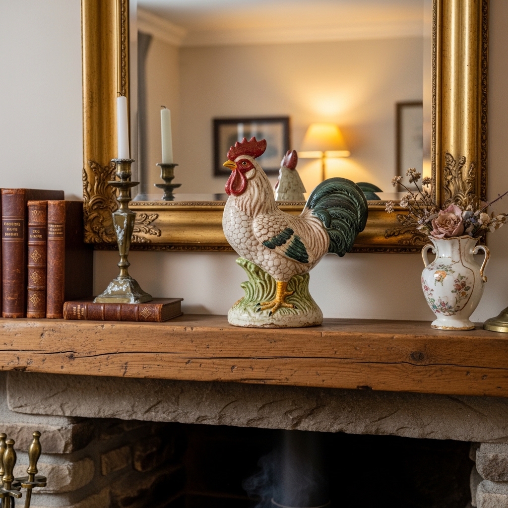 Find a ceramic rooster at a thrift store. Place it on the mantel. The colors should be muted. The glaze should be crackled.