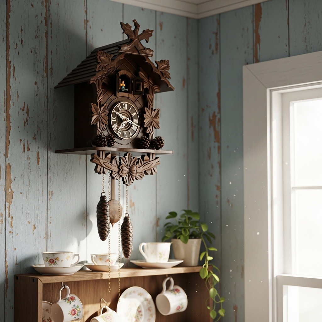 Hang a wooden cuckoo clock on the wall. The carvings should be detailed. The paint should be faded.