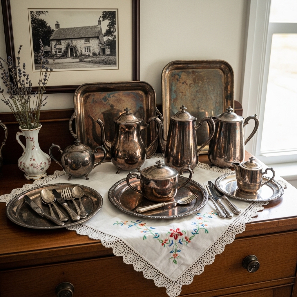 Arrange a collection of silver spoons, forks, and candlesticks on a sideboard. Let them tarnish naturally. The dark patina is beautiful.
