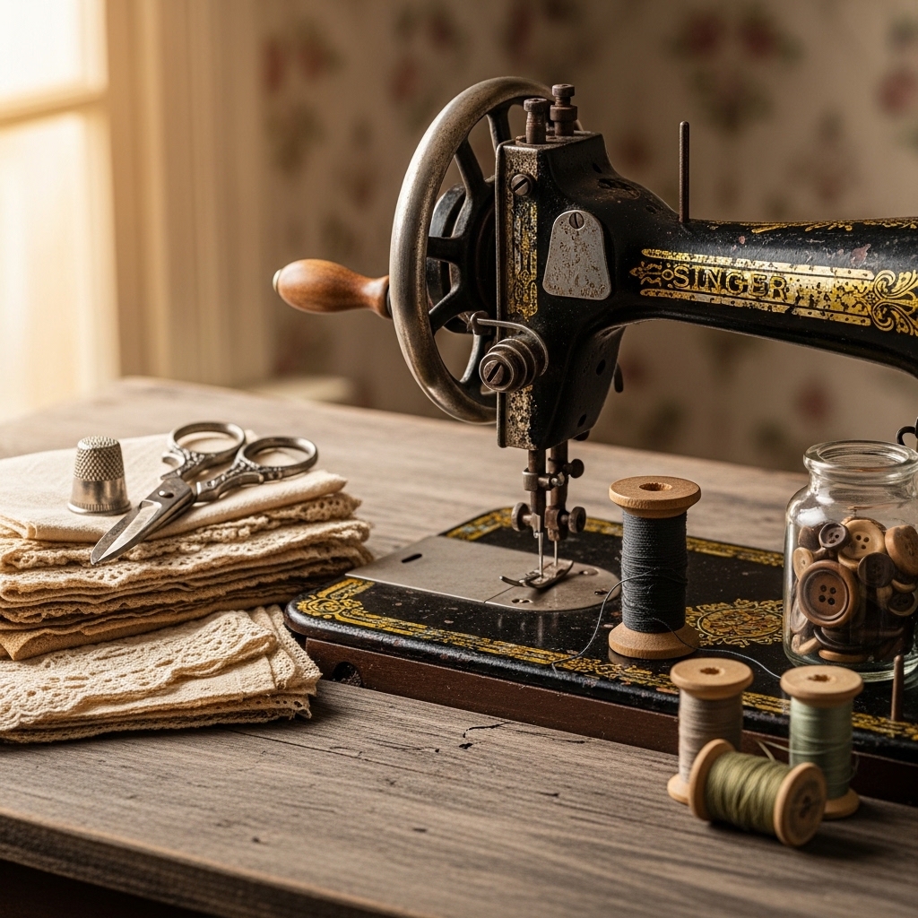 Use a vintage sewing machine as a side table. The machine should be cast iron. The finish should be black.