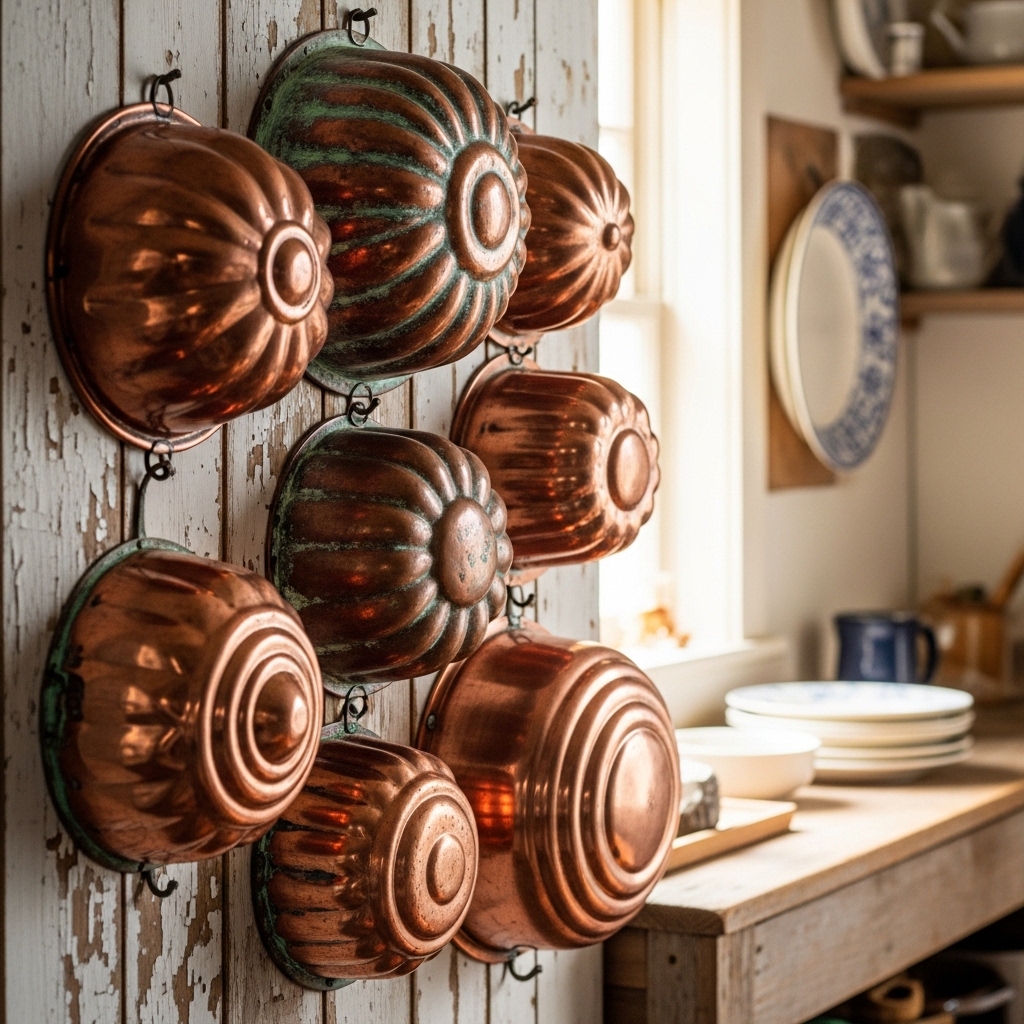 Collect copper jelly molds in different shapes. Hang them on a wall in a cluster. The copper will glow.