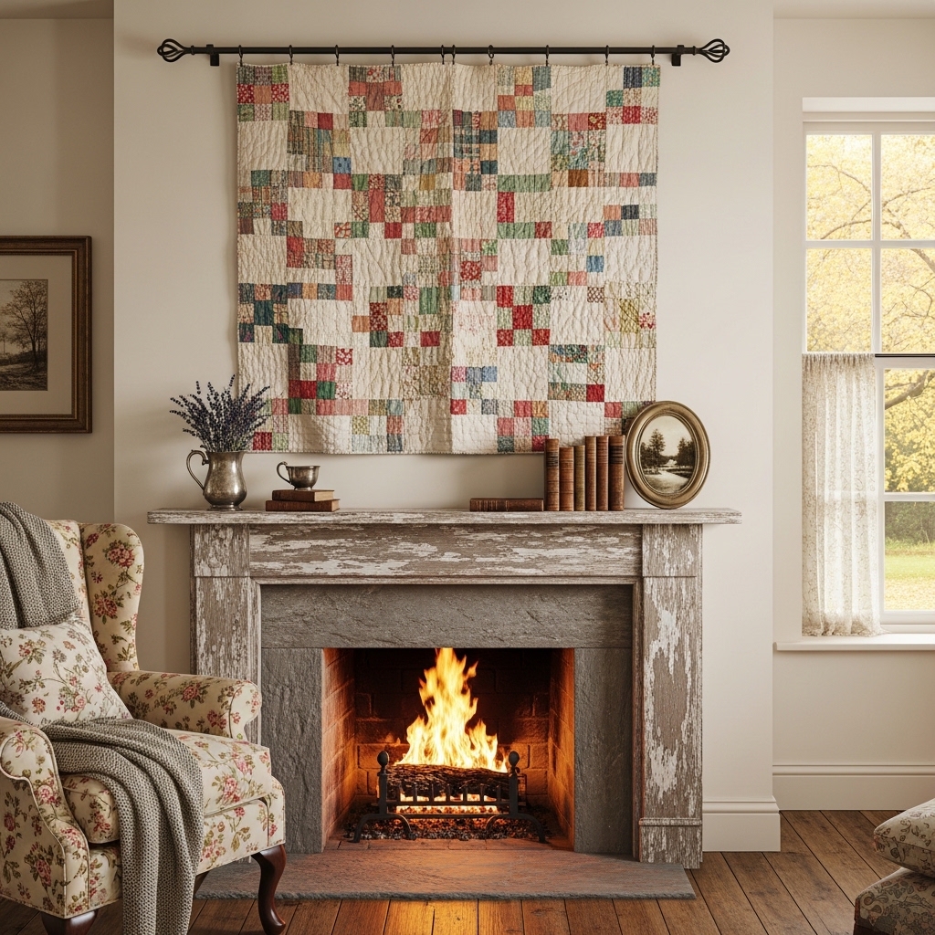 Hang a vintage quilt on a blank wall. The pattern should be traditional. Log cabin. Wedding ring. Double wedding ring.