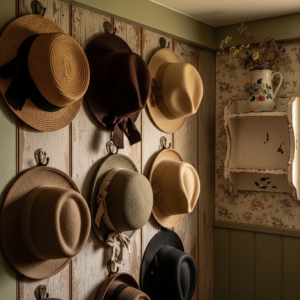 Collect vintage hats from estate sales. Hang them on the wall with hat pins. The brims will cast interesting shadows.